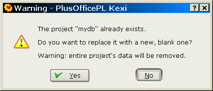Oops, 'mydb' database already exists. Kexi kindly asks us for permission to completely replace it: